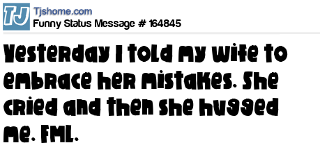 X says Yesterday I told my wife to embrace her mistakes. She cried and then she hugged me. FML.