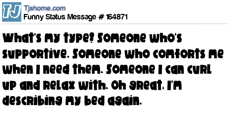 - # 154793 What's my type? Someone who is supportive. Someone who is warm. Someone I can just curl up and relax with. Wait I'm describing my bed again.