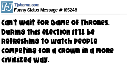 X says Can't wait for Game of Thrones. During this election it'll be refreshing to watch people competing for a crown in a more civilized way.