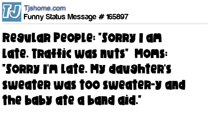 X says Regular People: "Sorry I am late. Traffic was nuts" Moms: "Sorry I'm late. My daughter's sweater was too sweater-y and the baby ate a band aid."