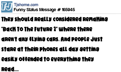 - # 167605 ... They should remake "Back to the Future." This time have no flying cars and just have everybody standing around staring at their phones and getting offended at everything.
