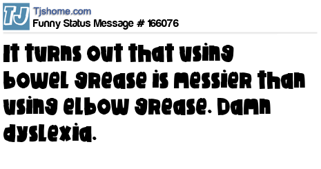 - # 157762 It turns out that using bowel grease is messier than using elbow grease ... damn dyslexia.