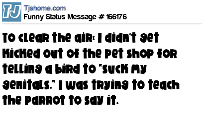 X says To clear the air: I didn't get kicked out of the pet shop for telling a bird to "suck my genitals." I was trying to teach the parrot to say it.