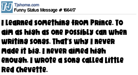 - # 166407 I learned something from Prince through my own shortcomings. And that was to aim as high as one possibly can when writing songs. That's the reason I never made it big. I never aimed high enough. I wrote a song called Little Red Chevette.