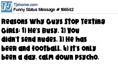 X says Reasons Why Guys Stop Texting Girls: 1) He's Busy. 2) You didn't send nudes. 3) He has beer and football. 4) It's only been a day, calm down psycho.