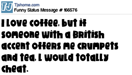 X says I love coffee, but if someone with a British accent offers me crumpets and tea, l would totally cheat.