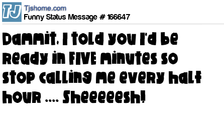 X Dammit, I told you I'd be ready in FIVE minutes so stop calling me every half hour .... Sheeeeesh!