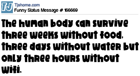 X says The human body can survive three weeks without food, three days without water but only three hours without wifi.
