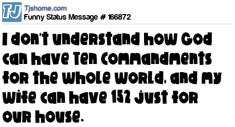 X says I don't understand how God can have Ten Commandments for the whole world, and my wife can have 152 just for our house.