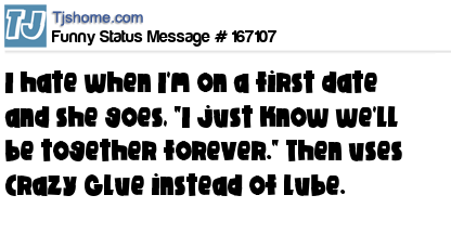 X I hate when I'm on a first date and she goes, "I just know we'll be together forever." Then uses Crazy Glue instead of lube.