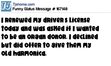 X I renewed my driver’s license today and was asked if I wanted to be an organ donor. I declined but did offer to give them my old harmonica.