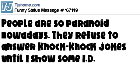 X People are so paranoid nowadays. They refuse to answer Knock-Knock jokes until I show some I.D.