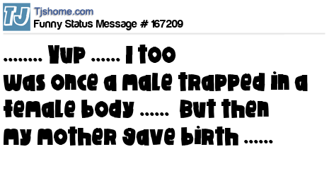 - # 208268 The only time I've ever felt like a male trapped in a female's body was the 9 months before I was born.
