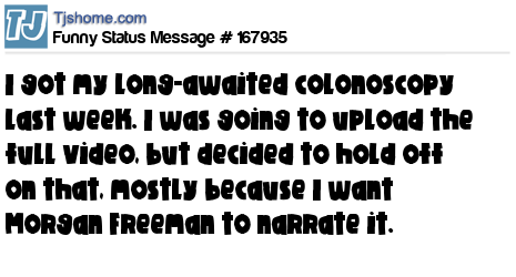 X says I got my long-awaited colonoscopy last week. I was going to upload the full video, but decided to hold off on that, mostly because I want Morgan Freeman to narrate it.