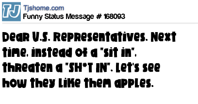 X Dear U.S. Representatives. Next time, instead of a "sit in", threaten a "SH*T IN". Let's see how they like them apples.