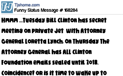 X Hmmm ...Tuesday Bill Clinton has secret meeting on private jet with Attorney General Loretta Lynch, On Thursday The Attorney General has ALL Clinton Foundation emails sealed until 2018. Coincidence? or is it time to wake up to the corrupting of America!!