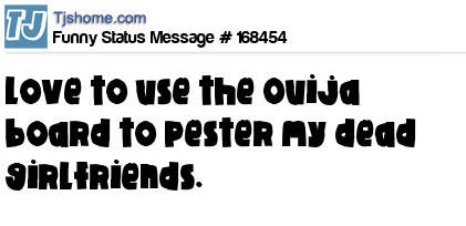 - # 65375 My Ouija board keeps saying "Boo! LOL J/K!" Stupid teenage ghosts.
