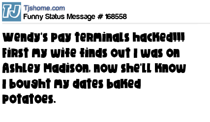 X says Wendy's pay terminals hacked!!! First my wife finds out I was on Ashley Madison, now she'll know I bought my dates baked potatoes.