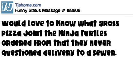 X says Would love to know what gross pizza joint the Ninja Turtles ordered from that they never questioned delivery to a sewer.