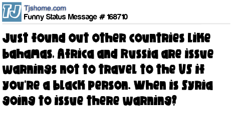 X says Just found out other countries like bahamas, Africa and Russia are issue warnings not to travel to the US if you're a black person. When is Syria going to issue there warning?