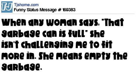 X says When any woman says, "That garbage can is full" she isn't challenging me to fit more in. She means empty the garbage.