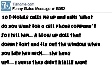 X so T-Mobile calls me up and asks "what do you want for a cell phone company" ? So I tell him.... A blow up doll that doesn't fart and fly out the window when you bite her neck.......she hung up!..... I guess they didn't REALLY want to know!