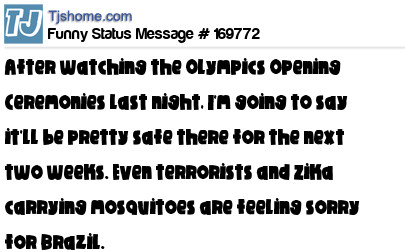 X After watching the Olympics Opening Ceremonies last night, I'm going to say it'll be pretty safe there for the next two weeks. Even terrorists and Zika carrying mosquitoes are feeling sorry for Brazil.