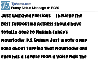 X Just watched Precious.... I believe the Best Supporting Actress should have totally gone to Mariah Carey's moustache. P.S. Eminem just wrote a rap song about tapping that moustache and even has a sample from a voice mail the flavor saver left him....