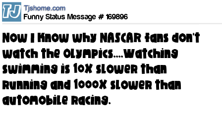 X Now I know why NASCAR fans don't watch the Olympics....Watching swimming is 10X slower than running and 1000X slower than automobile racing.