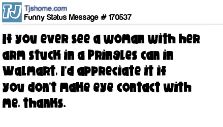 X says If you ever see a woman with her arm stuck in a Pringles can in Walmart, I'd appreciate it if you don't make eye contact with me, thanks.