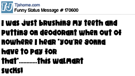 - # 110453 Just brushing my teeth & putting on deodorant when out of nowhere I hear, "You're going to have to pay for that!" This Wal-Mart sucks.