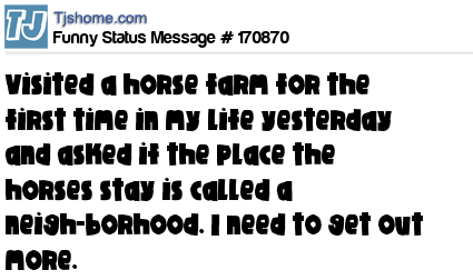 X says Visited a horse farm for the first time in my life yesterday and asked if the place the horses stay is called a neigh-borhood. I need to get out more.