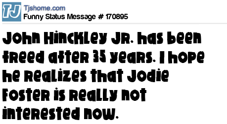 X says John Hinckley Jr. has been freed after 35 years. I hope he realizes that Jodie Foster is really not interested now.