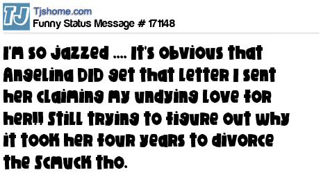 X I'm so jazzed .... It's obvious that Angelina DID get that letter I sent her claiming my undying love for her!! Still trying to figure out why it took her four years to divorce the Scmuck tho.