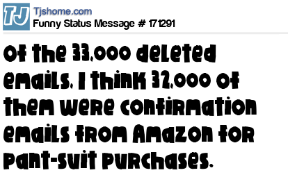 X Of the 33,000 deleted emails, I think 32,000 of them were confirmation emails from Amazon for pant-suit purchases.