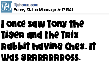 X says I once saw Tony the Tiger and the Trix rabbit having Chex. It was grrrrrrross.