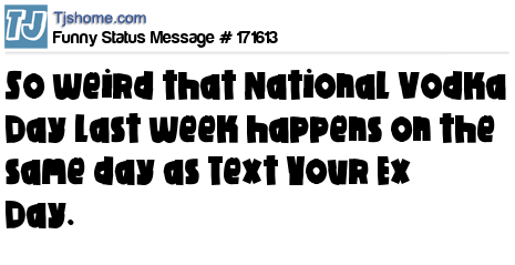 X says So weird that National Vodka Day last week happens on the same day as Text Your Ex Day.
