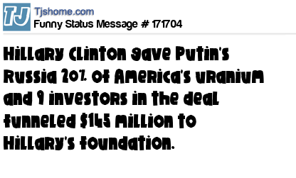 - # 171701 Hillary Clinton gave Putin's Russia 20% of America's uranium and 9 investors in the deal funneled $145 million to Hillary's foundation. Hillary said blacks and Muslims are "professional never-do-wells". Muslims are "Sand N!gger$"