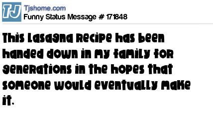 - # 166903 My family's recipe for lasagna has been handed down for generations: 1) Collect the freshest ingredients. 2) Find a woman cook it. 3) Eat....