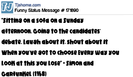X says "Sitting on a sofa on a Sunday afternoon. Going to the candidates' debate. Laugh about it, shout about it When you've got to choose Every way you look at this you lose" - Simon and Garfunkel (1968)