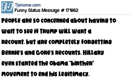 X says People are so concerned about having to wait to see if Trump will want a recount, but are completely forgetting Bernie's and Gore's recounts. Hillary even started the Obama "birther" movement to end his legitimacy. #hypocrites