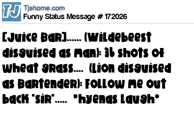 X says [Juice Bar]...... (Wildebeest disguised as man): 36 shots of wheat grass.... (Lion disguised as Bartender): Follow me out back "sir"..... *hyenas laugh*