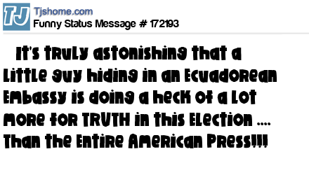 X says It's truly astonishing that a little guy hiding in an Ecuadorean Embassy is doing a heck of a lot more for TRUTH in this Election .... Than the Entire American Press!!!