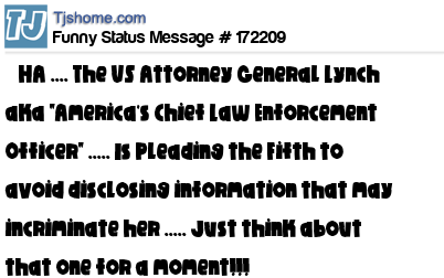X says HA .... The US Attorney General Lynch aka "America's Chief Law Enforcement Officer" ..... Is Pleading the Fifth to avoid disclosing information that may incriminate her ..... Just think about that one for a moment!!!
