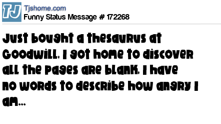 X says Just bought a thesaurus at Goodwill, I got home to discover all the pages are blank, I have no words to describe how angry I am...