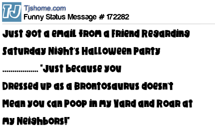 X says Just got a email from a Friend Regarding Saturday Night's Halloween Party .................. "Just because you Dressed up as a Brontosaurus doesn't Mean you can Poop in my Yard and Roar at my Neighbors!"