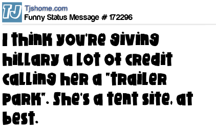 X says I think you're giving hillary a lot of credit calling her a "trailer park". She's a tent site, at best.