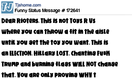 X Dear Rioters, This is not Toys R Us where you can throw a fit in the aisle until you get the toy you want. This is an ELECTION. Hillary LOST. Chanting Fu#k Trump and burning flags WILL NOT change that. You are only proving WHY t