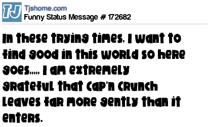 X says In these trying times, I want to find good in this world so here goes,,,,, I am extremely grateful that Cap'n Crunch leaves far more gently than it enters.
