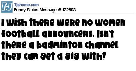 X I wish there were no women football announcers. Isn't there a badminton channel they can get a gig with?